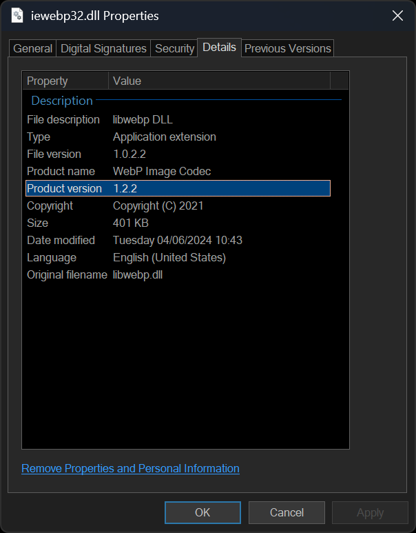 Or you can explicitly set the WebP DLL using IEGlobalSettings().WebPEngine := ieenDLL;